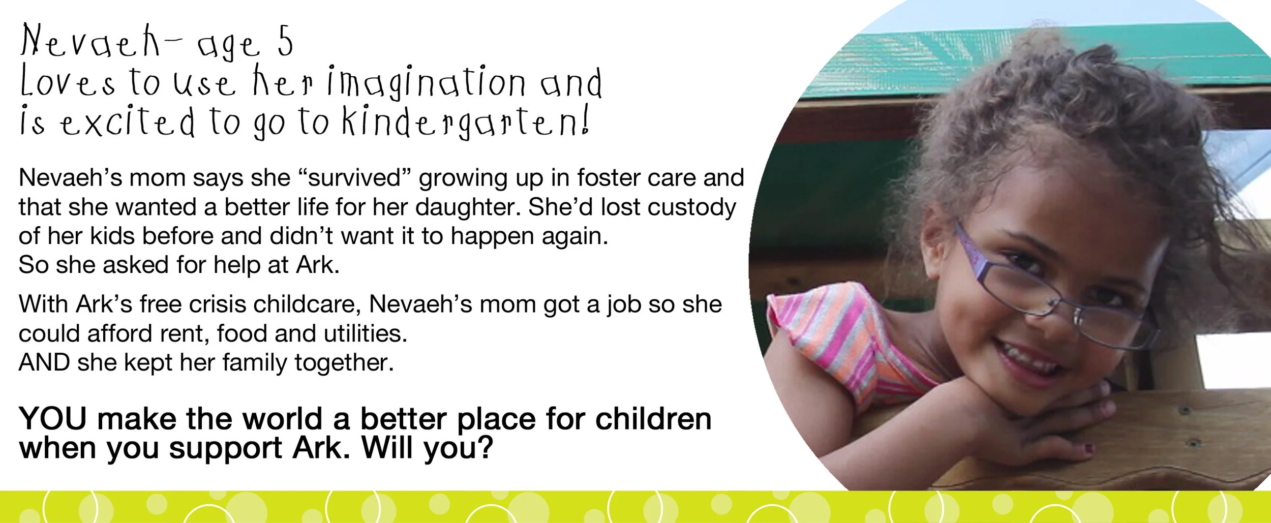 When you support Ark, you provide a safe place for children and a resource for parents and caregivers to help them reduce the stress in their lives. When family stress is reduced, children are less likely to be abused or neglected.